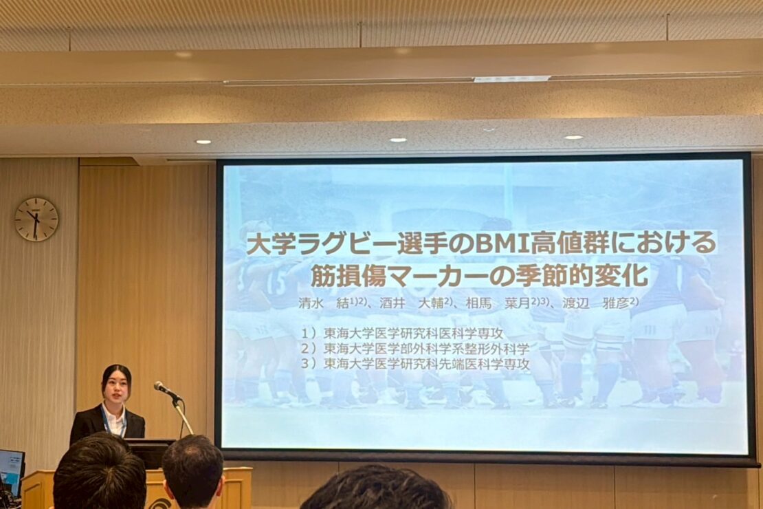 東海大学ラグビー部の2024年度 アスリート健診の結果をもとに、ラグビー選手の特徴から解析を行い発表しました。BMIによる群分けによって、将来の脳血管疾患・心疾患等のリスクや肝機能状態の傾向が見えてきつつあります。聴講席より、多くのご意見をいただき、発表者にとっても学びの多い時間となりました。