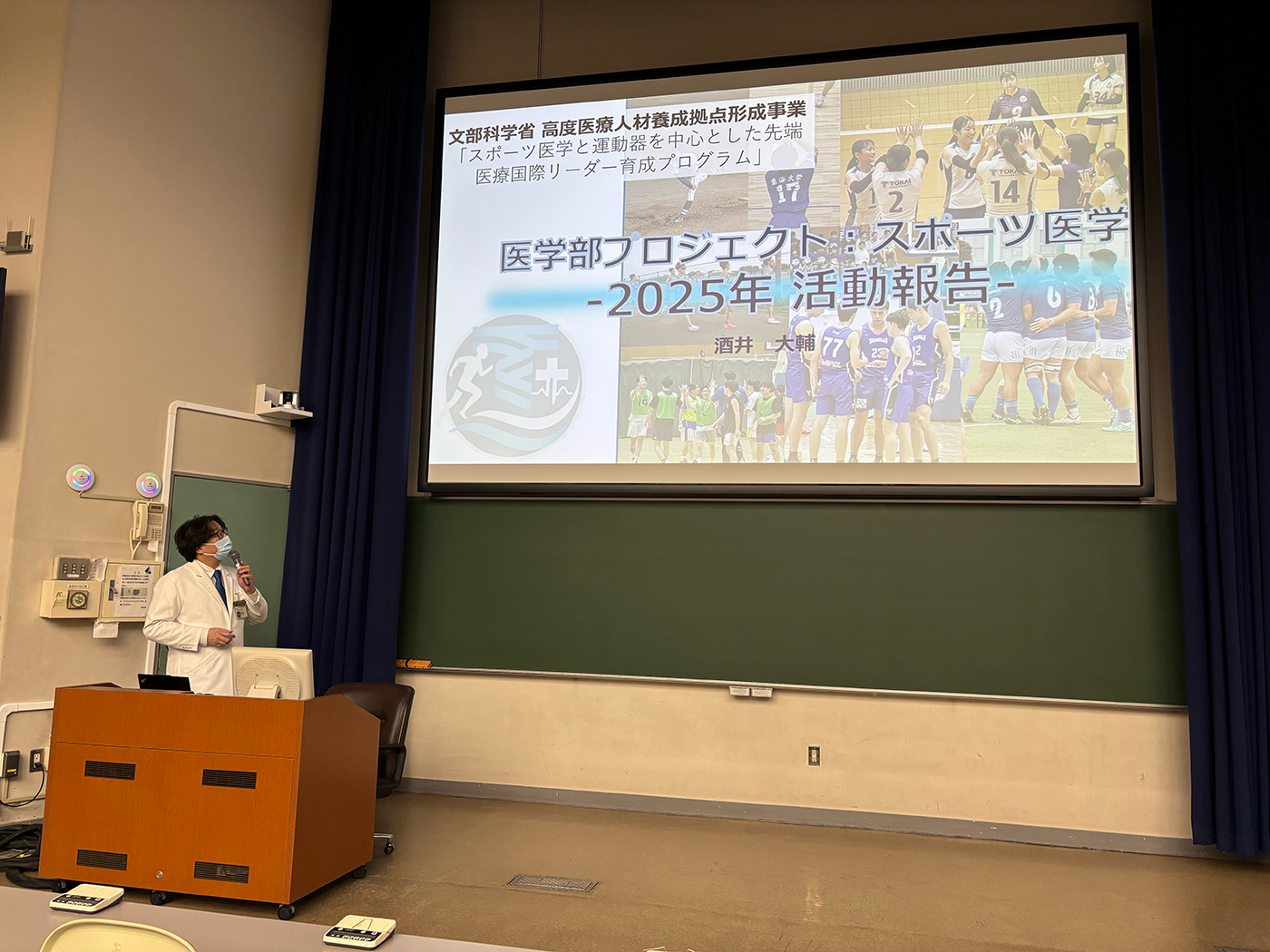 2026年3月3日に東海大学伊勢原キャンパスにて、2025年度医学部医学科研究成果報告会が開催され、 スポーツ医学プロジェクト活動報告を実施しました。2022年、本学陸上競技部長距離ブロックのサポートから始まった本プロジェクトは、今年度で4年を迎え、研究活動やクラブ帯同、女性アスリートサポートなど、その活動の幅が大きく広がる1年となりました。その裏には、付属病院のスタッフをはじめとする多くの皆様の献身的なさサポートがありました。今回は、プロジェクト全体の活動内容や結果を関係者の皆様へお伝えする場として、プロジェクトの代表を務める酒井大輔先生(整形外科)より報告を行いました。